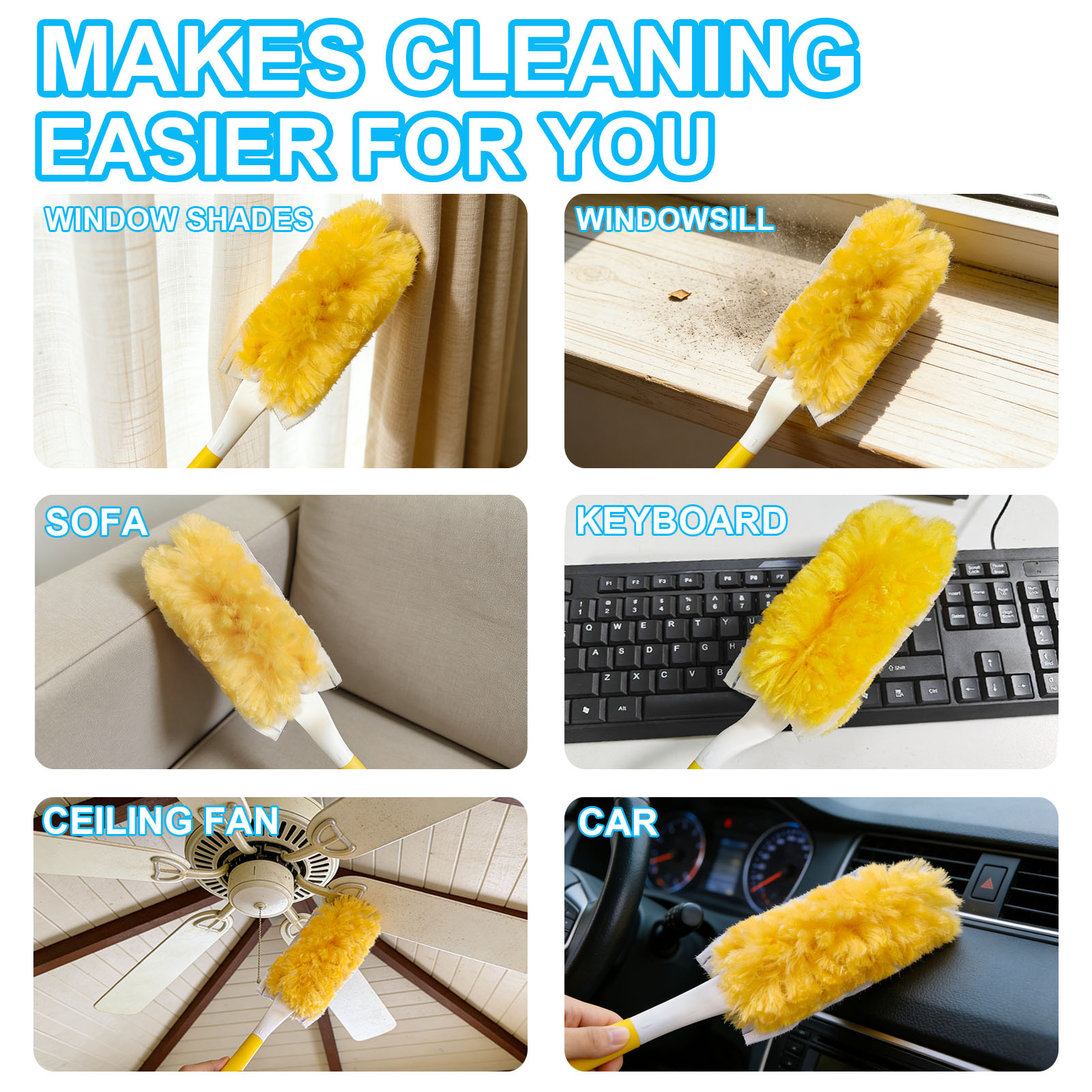 • WIDELY APPLICABLE- Can be used to clean electronic equipment, furniture, ornaments, desktops, vases, bookshelves, windows, blinds, ceiling fans, vents, garage tools and car spaces and many other scenarios.